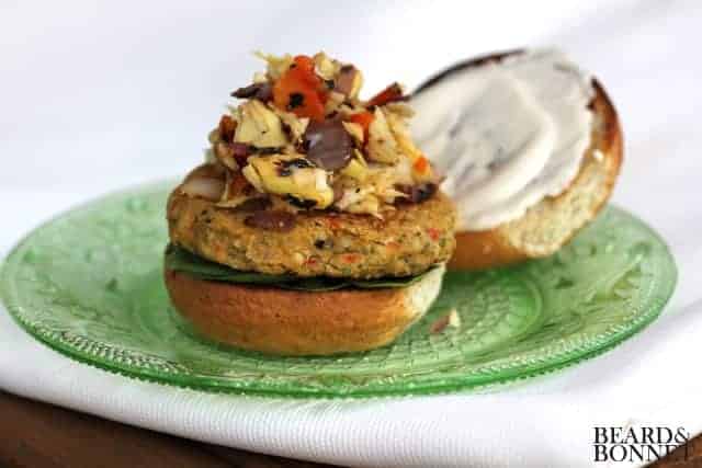 Heat a grill pan over med-high heat and spray lightly with cooking spray. Place artichoke hearts, bell pepper, and onion onto grill pan and cook until vegetables are tender and cooked through. When done remove from the grill pan and chop into uniform size pieces. Mix all of the vegetables with the salt and set aside. This recipe makes enough to generously top 5 burgers with leftovers. I used our extra veggies in an omelet the next morning.