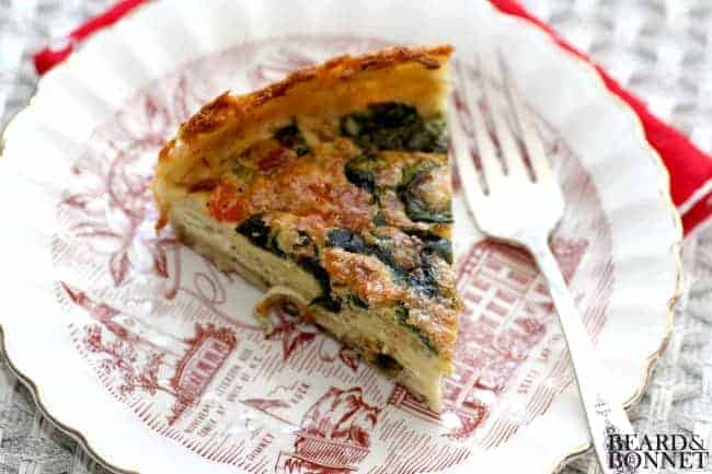 In a large bowl, whisk the gf/df sour cream, 1 ½ tsp. coarse salt, ¼ tsp. pepper, and nutritional yeast until combined. When fully incorporated whisk in the remaining 11 eggs and beat the mixture until smooth. *I use an immersion blender for the last part; it just makes my life easier! Stir in the spinach and onion mixture and pour the bowl into the crust. Bake until set, 40-50 minutes. Remove quiche from pan and peel away waxed paper before serving.